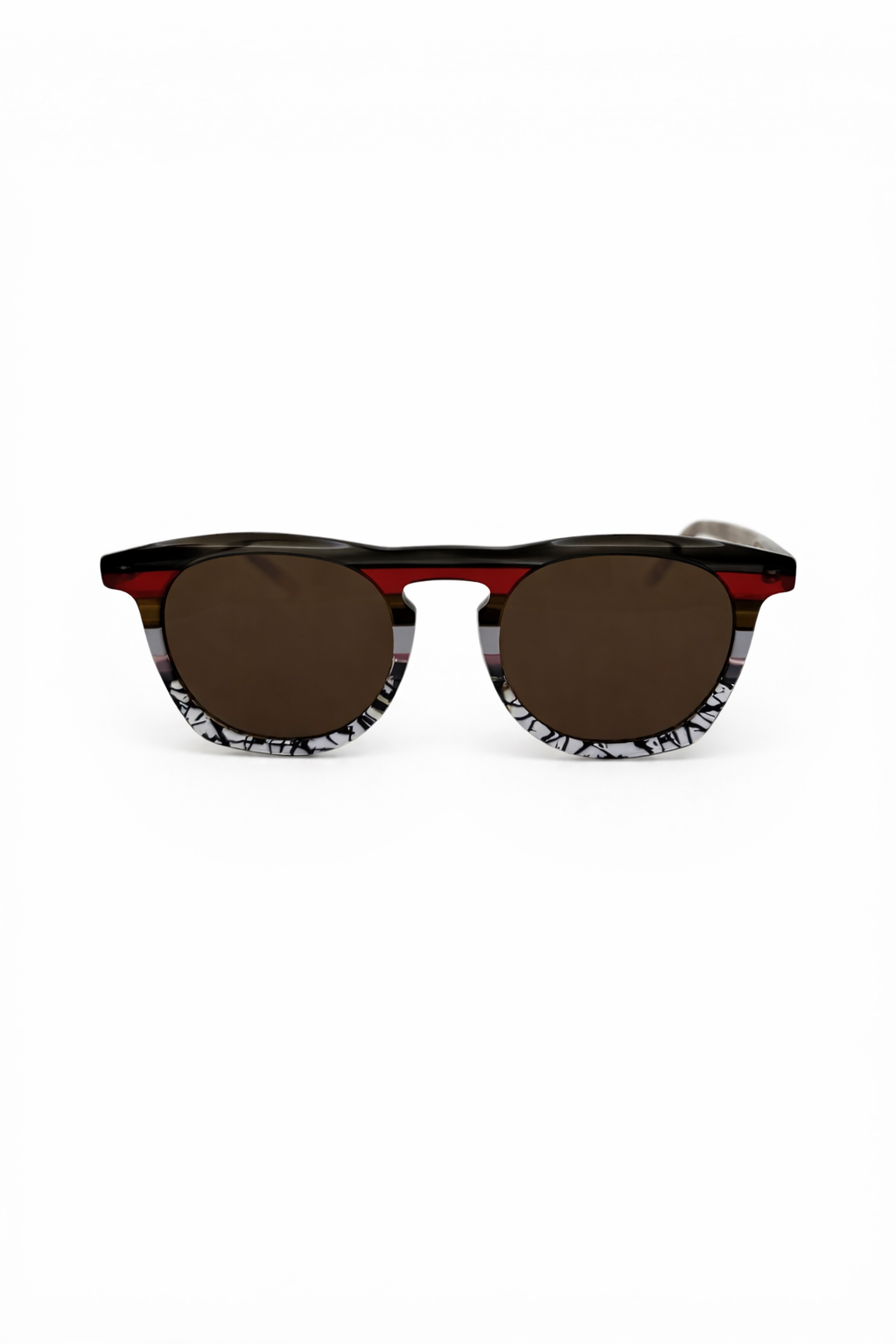 Affirmez votre style avec ces lunettes de soleil au design audacieux et contemporain. Leur monture se distingue par un jeu de contrastes unique : une structure noire élégante, rehaussée d’une touche rouge intense et d’un motif graphique noir et blanc pour une signature résolument moderne.
