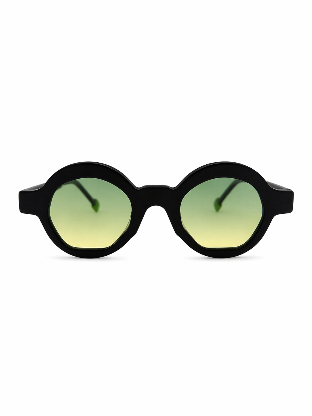 Ces lunettes de soleil jouent sur un contraste subtil entre intensité et légèreté. La monture noire profonde apporte une base élégante et intemporelle, tandis que les verres dégradés aux nuances vertes et dorées évoquent une lumière douce et apaisante.